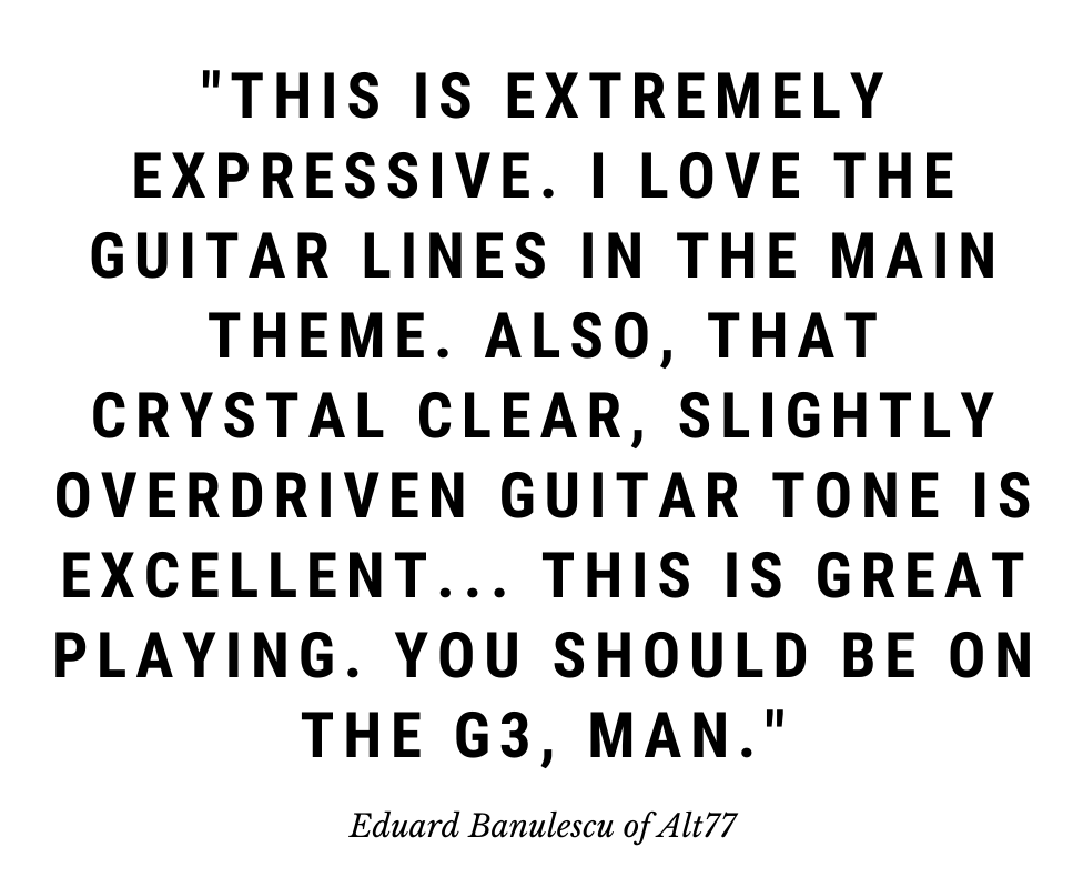 The moments with the dual electric guitars reminded us in places of the Scorpions, with a very grand sound, whilst there’s moments in the sole guitar parts that reminded us of one or two Steve Vai techniques... This is an expertly performed track with great scoring and lots of interest to maintain its listeners.